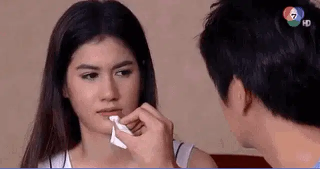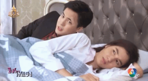 โก้วศิน (Kovasin) and พิ้งค์พลอย (Pinkploy) in bed from the Thai drama 'ขิงก็ราข่าก็แรง', with Kovasin trying to talk to an annoyed Pinkploy.