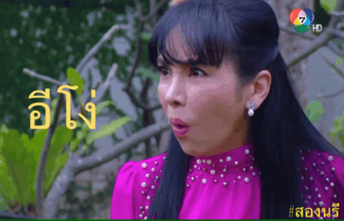 A woman in a pink dress from the Thai drama Song Naree says 'You fool' (อีโง่) on Ch7drama.