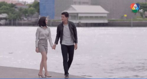 Now Tisanart and Kem Hussawee from Hua Jai Luk Phu Chai holding hands and walking by the water.