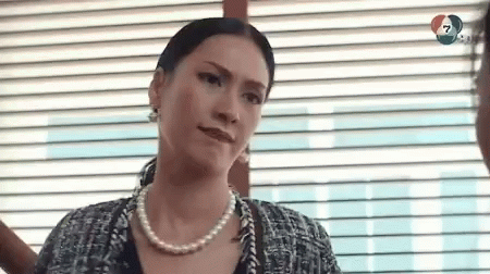 An angry woman from the Thai drama "พชรมนตรา" (Pacharamanthra) on Ch7, wearing a pearl necklace.