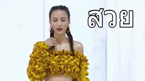 Green Ausadaporn poses in a vibrant yellow ruffled off-shoulder top and large hoop earrings.