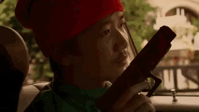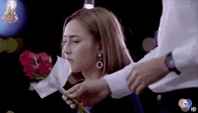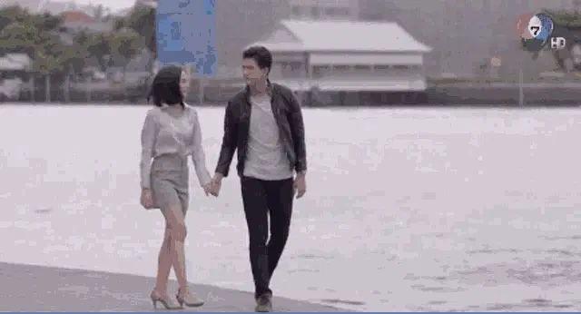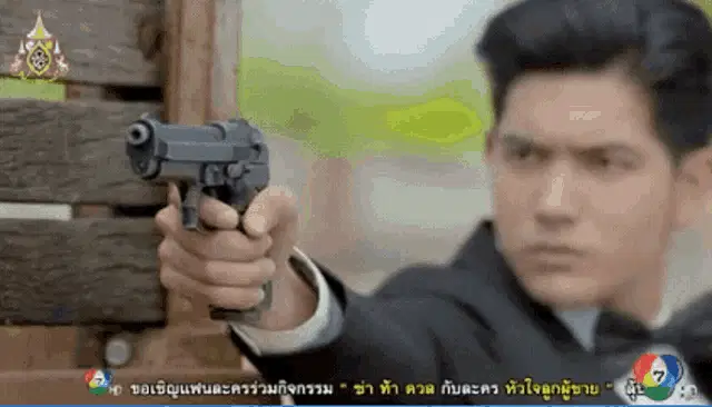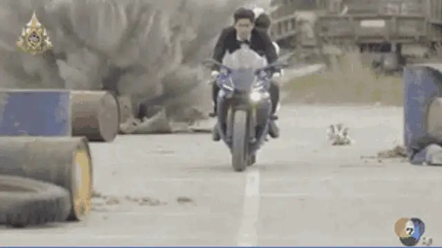 Two young men from Ch7drama Huachailukphuchai, one in green, react to a playful hit on the arm.