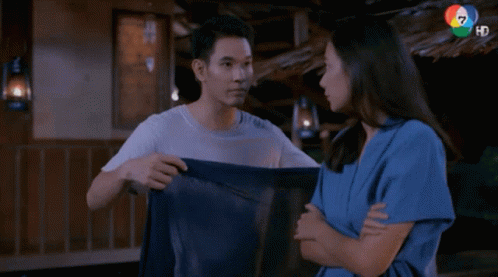 Om Akapan gently places a blanket over Sammy Cowell's shoulders in a scene from the Thai drama Plerng Pritsana.