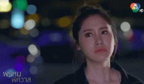 A woman from the Thai drama 'Prom Pissawat' (พิมพิมประภา) appears upset, with tears in her eyes, against a blurry night background.