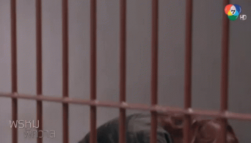 Pim Pimprabha, a character from the Thai drama Prom Pissawat, sits sadly in a jail cell, looking distressed.