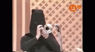Chacal Joven, wearing a black hood, plays the trumpet on the classic variety show Sabado Gigante with Don Francisco.