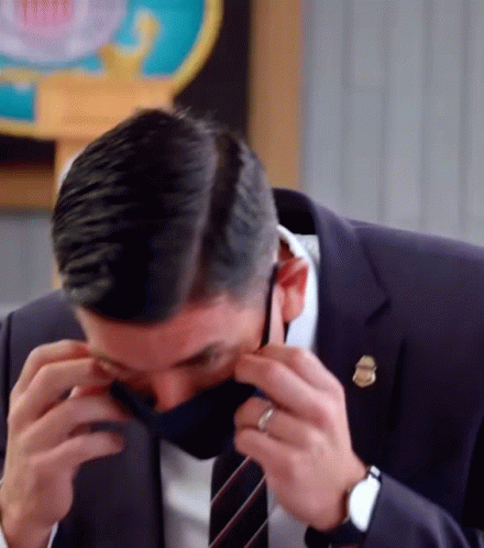 Chad Wolf, Acting Secretary of Homeland Security, adjusts his face mask while in an official setting.
