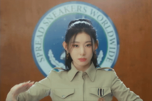 Chaeryeong in a military-style uniform salutes in front of a 'Spread Sneakers Worldwide' logo.