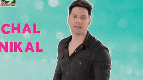 Bollywood actor Varun Dhawan energetically gestures in a black shirt against a vibrant teal background.