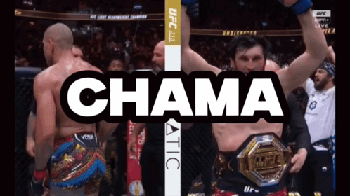 Alex Pereira celebrates with his championship belt after a UFC 313 fight, with Magomed Ankalaev nearby. 'CHAMA!'