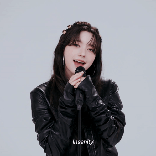 Chanelle Moon performs a song with the caption 'Insanity' displayed, wearing a black leather jacket.