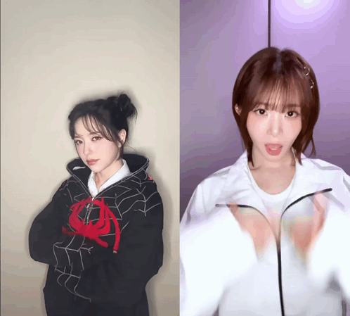 a woman in a spider man hoodie and a woman in a white shirt