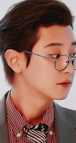 EXO's Chanyeol, also known as Loey, looking stylish in glasses, a red plaid shirt, and a bow tie.