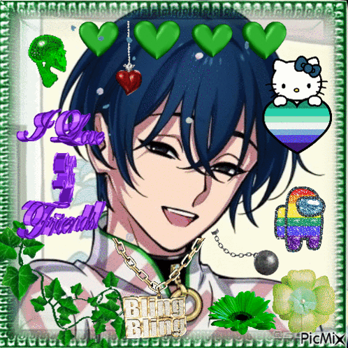 Iori Motohashi from Charisma House in an anime portrait, adorned with green hearts and pop culture icons.