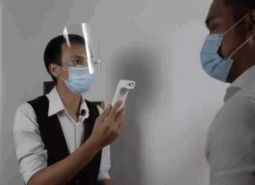 Charles The French skit featuring a man in a face shield checking another man's temperature with a thermometer.