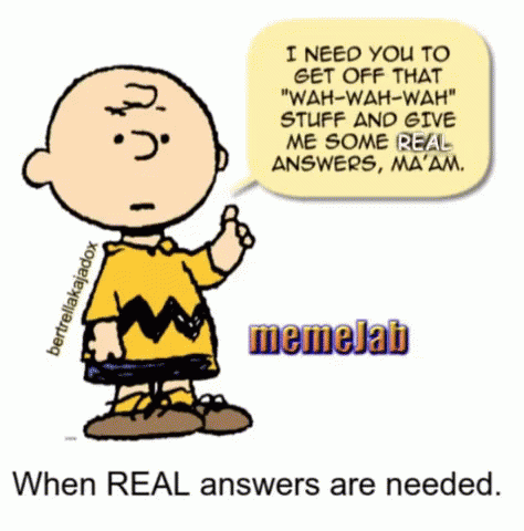Charlie Brown demands real answers, telling someone to stop with the 'wah-wah-wah' and provide facts.