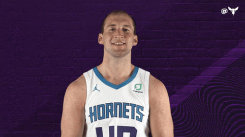 Cody Zeller, wearing his Charlotte Hornets jersey, smiles and claps enthusiastically.