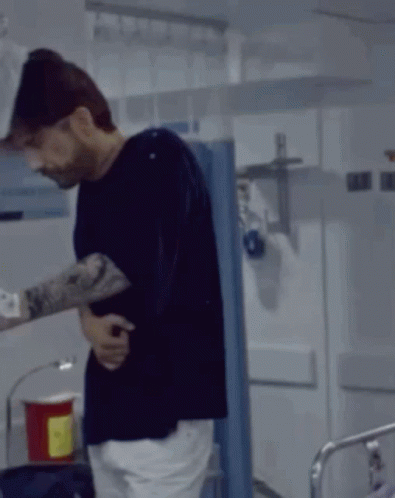 Charlyflow Lareinadelflow, a man with tattoos, stands in a hospital room, appearing to be in discomfort.