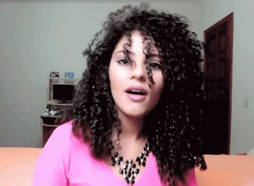 Larissa Rezende shows off her beautiful curly hair, flipping it and looking up with charm, wearing a pink shirt and necklace.