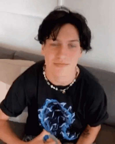 Chase Hudson Lilhuddy smiles while sitting on a couch, wearing a black t-shirt and beaded necklace.