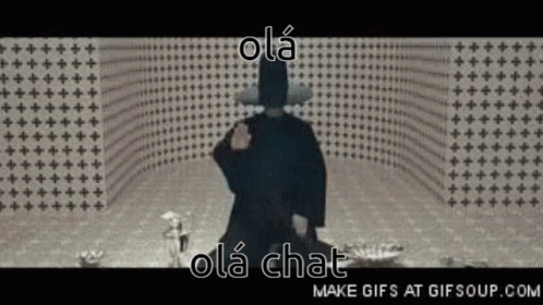A person in a wide-brimmed hat and robe waves, with the text 'olá chat' appearing on screen.