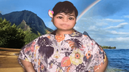 Tita, with a flower in her hair, reacts with 'CHE!!!' on a scenic beach background with a rainbow.