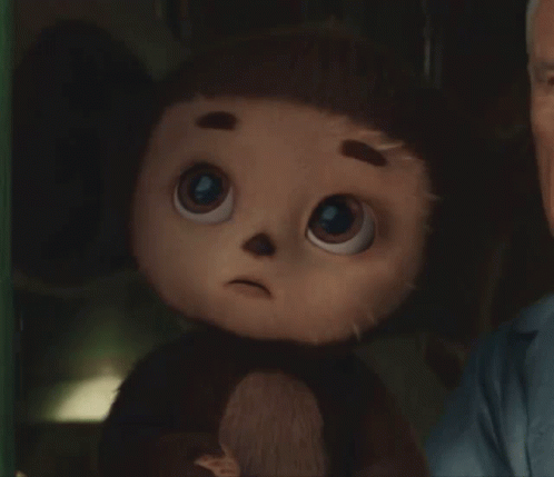 Adorable Cheburashka, the fluffy, big-eared 3D CGI character from the live-action Russian movie, looking curious.
