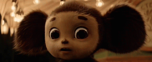 Close-up of the adorable Russian character Cheburashka, a fluffy animal with big ears, looking curious.