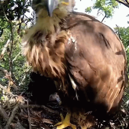 A curious buzzard hawk chick in its nest looks directly at the camera, associated with Robert E Fuller.