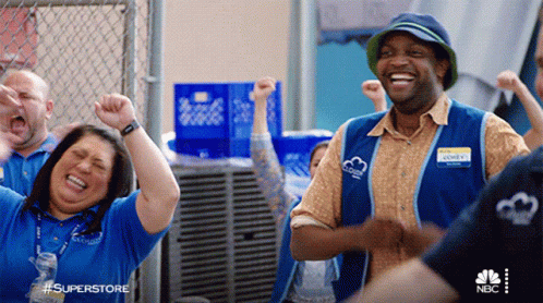 Sandra, played by Kaliko Kauahi, and her Superstore co-workers joyfully cheer with fists in the air.