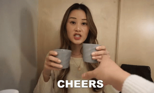 A woman holding two cups, saying 'Cheers' with Yoonpic.