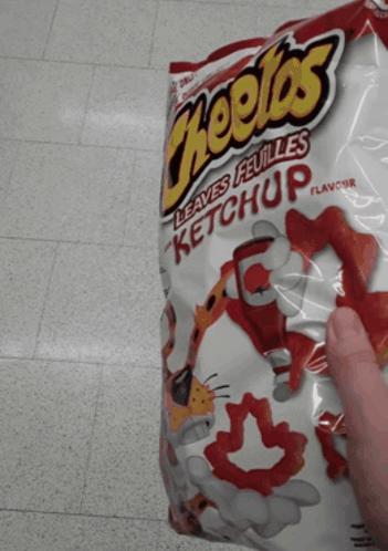 A person holds a bag of Cheetos Leaves Ketchup flavor chips, showcasing the unique leaf-shaped snacks.