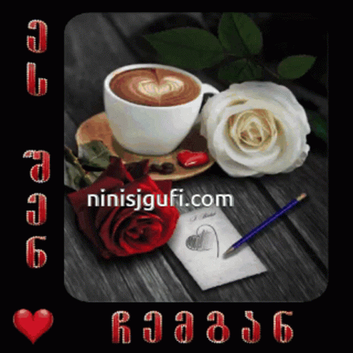 A beautiful good morning message featuring a cup of coffee with a heart, red and white roses, and a note.
