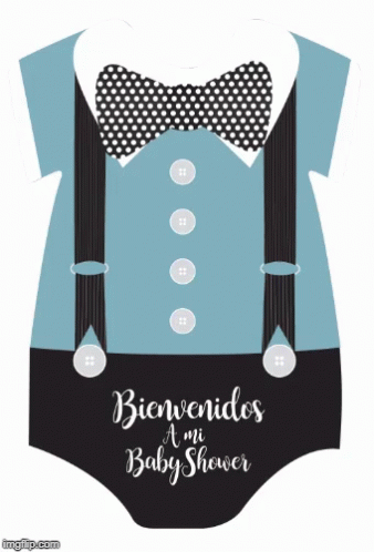 Baby shower invitation for Juan Pablo and Adriana, featuring a cute onesie design with suspenders and a bow tie.