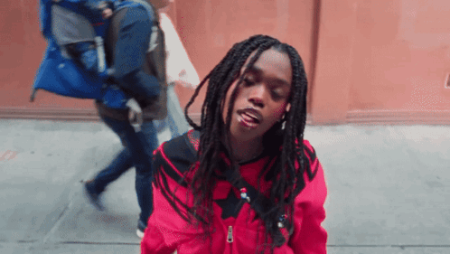 a young man with dreadlocks is wearing a red jacket with a star on the front