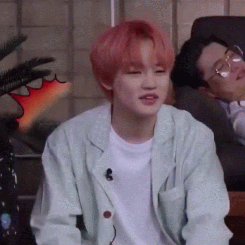 Chenle, with pink hair, laughs heartily while sitting in a chair, a microphone clipped to his jacket.