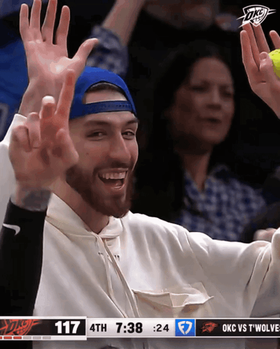 Chet Holmgren, wearing a white hoodie and blue cap, smiles and waves excitedly at an OKC Thunder game.