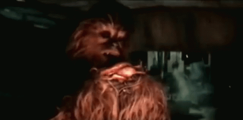Chewbacca prepares to eat a roasted Porg, but is guilt-tripped by a group of sad Porgs in Star Wars: The Last Jedi.