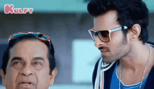 Prabhas and Brahmanandam in a scene from Rebel Movie, with Brahmanandam making a funny, surprised face.
