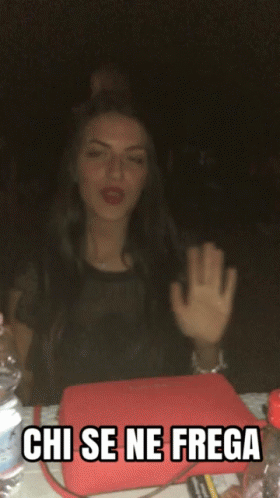 A woman at a table expresses indifference with the Italian phrase 'Chi Se Ne Frega' while moving to music.