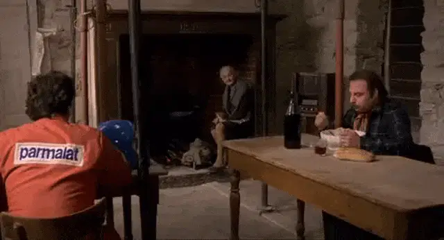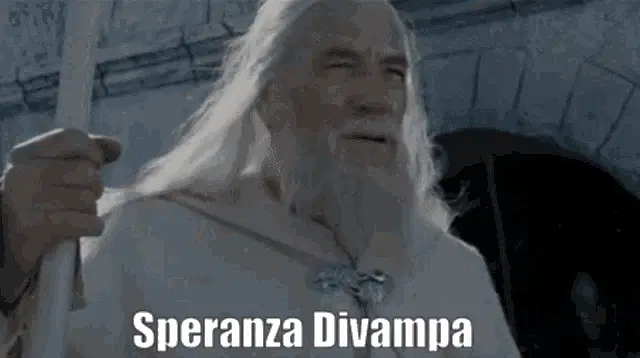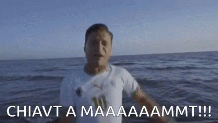 Man in a white shirt yells 'Chiavt A Mammt' while standing in the ocean, featuring Speranza.