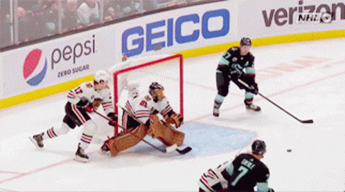 Chicago Blackhawks goalie Marc Andre Fleury makes a crucial big save during an intense hockey game.