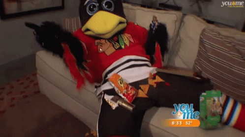 Chicago Blackhawks mascot Tommy Hawk relaxing on a couch, surrounded by snacks like Cheetos and Doritos.