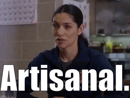 Stella Kidd (Miranda Rae Mayo) from Chicago Fire looks thoughtful with the word 'Artisanal' visible.
