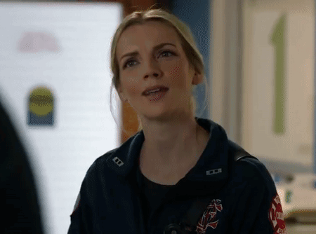 Kara Killmer as Sylvie Brett from Chicago Fire, wearing her uniform, gives a dismissive scoff during a conversation.