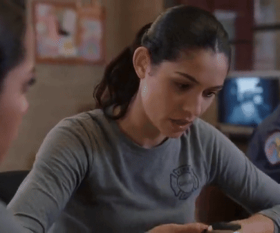 Stella Kidd (Miranda Rae Mayo) from Chicago Fire intently looking at her phone.