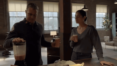 a man is pouring something into a blender while a woman drinks from a glass