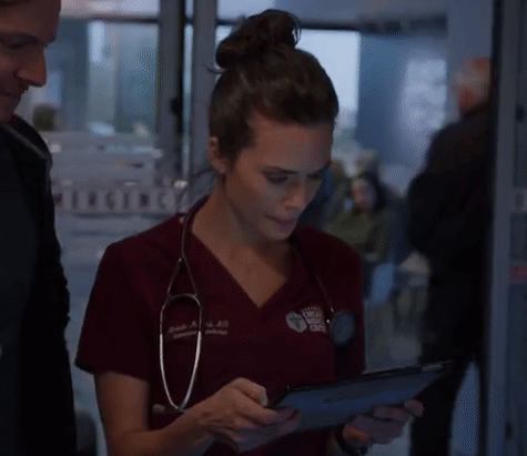 Natalie Manning from Chicago Med, played by Torrey DeVitto, reviews information on a tablet in a hospital.