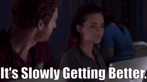 Natalie Manning from Chicago Med says 'It's Slowly Getting Better' while sitting next to a man.