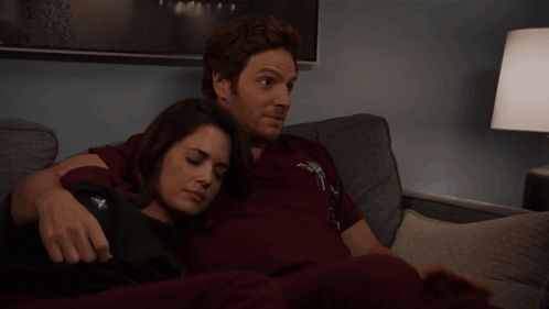 Nick Gehlfuss as Will Halstead shushes while a woman rests on his shoulder on a couch, in a quiet moment from Chicago Med.
